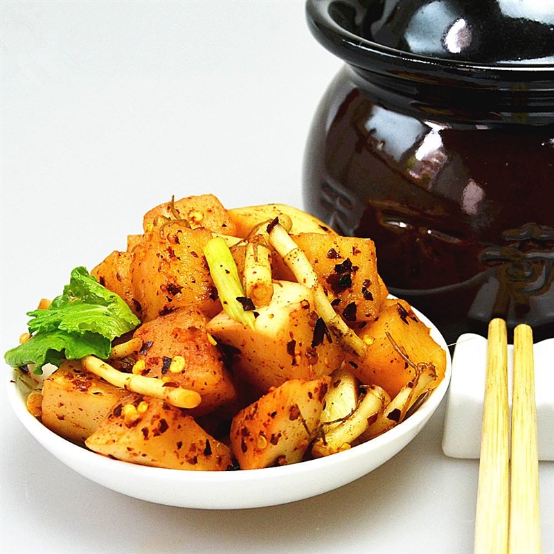 泡菜是銅仁人民日常生活中不可缺少的食物,它不僅制作簡便,原料充足,經濟實惠,省時省力,便于保存,而且還脆嫩鮮香,花樣多變,清涼爽口,富有營養(yǎng),增進食欲,所以深受人們的喜愛。而其中以酸蘿卜為其經典之作。泡酸蘿卜主要以蘿卜為原料,浸泡在加有多種調味料和香料的鹽水中,經發(fā)酵制作而成的。蘿卜在鹽水中發(fā)酵,主要是在乳酸菌的作用下進行。乳酸菌是利用原料中的糖分發(fā)酵生成,乳酸能抑制有害微生物活動而起到保存泡菜的作用,并使蘿卜產生酸味,清脆涼爽,質地清脆,香氣濃郁,成酸甜鮮,稍帶辣味,便于貯存。