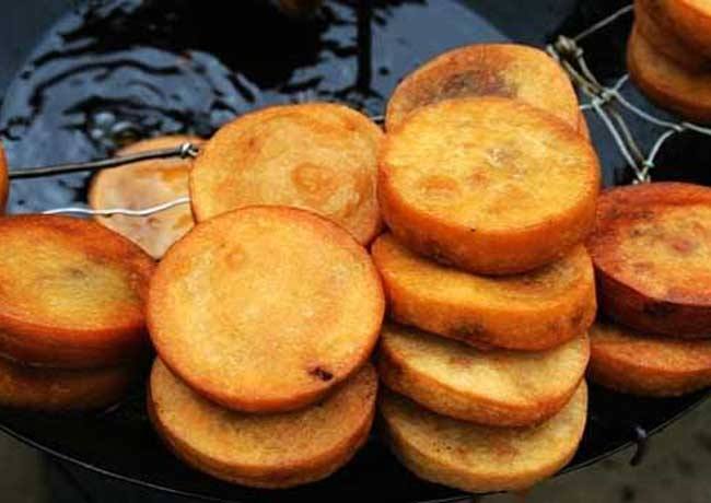 油而不膩的油粑粑,常常會是銅仁人民早餐中的一部分。它以大米、糯米、黃豆三種主料分別以3:4:3的比例分別浸泡半天,再一起磨漿,可依個人口味加入蔥絲、蒜苗絲和糟辣椒,再以小勺盛滿倒入特制的盒中,放入加熱的菜油鍋里,至變成焦黃色后控掉油即可食用。其口感香脆,色澤黃亮,糯香純正,粘度適當,不粘牙。